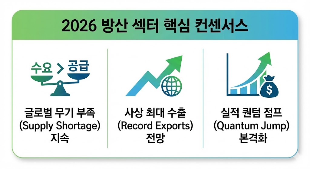핵심 요약: 2026년 대한민국 방산 섹터는 '일시적 테마'를 넘어 **'구조적 성장기(Super Cycle)'**에 진입했습니다. 러시아-우크라이나 전쟁 장기화, 중동 정세 불안, 그리고 트럼프 2기 행정부(가정) 등의 지정학적 리스크로 인해 글로벌 무기 수요가 공급을 초과하는 'Supply Shortage'가 지속되고 있습니다. JP모건, 골드만삭스 등 주요 IB들은 2026년을 K-방산 사상 최대 수출의 해로 전망하고 있습니다.