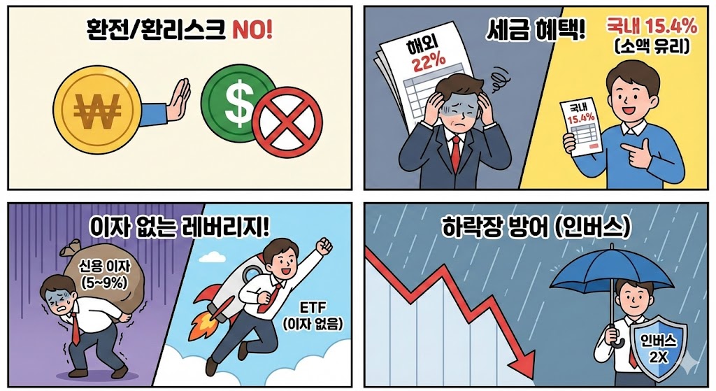 증권사에서 돈을 빌려(신용융자) 레버리지를 일으키면 높은 이자 비용(연 5~9%)이 발생하고 반대매매 위험이 큽니다. ETF는 이자 비용 없이 구조적으로 2배 효과를 낼 수 있어, 단기 트레이딩 시 비용 효율적입니다.