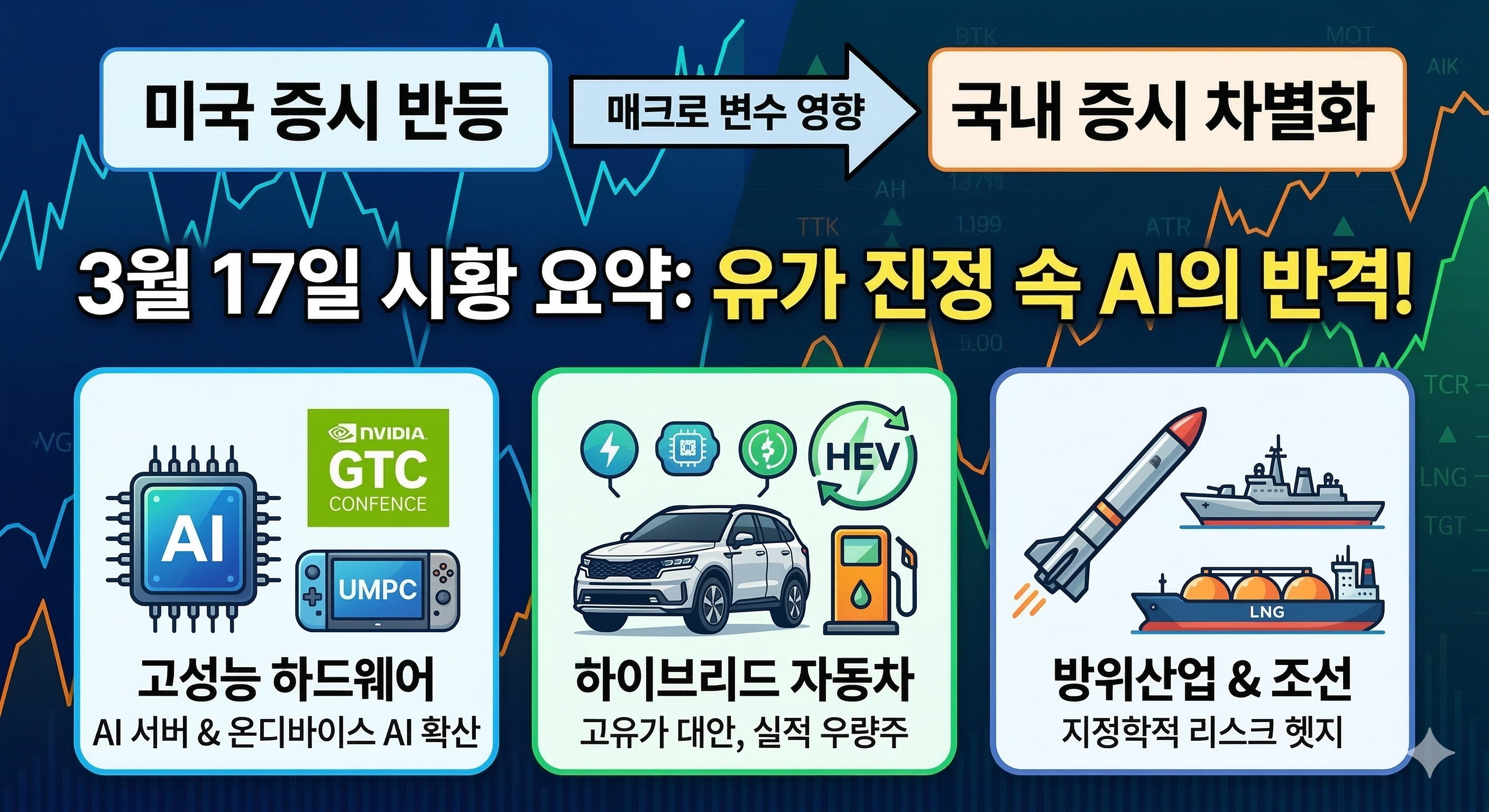- 엔비디아 GTC 2026 개막: 현지시간 16일 개막한 엔비디아의 'GTC 2026' 컨퍼런스에서 차세대 AI 로드맵이 공개되며, 반도체 및 빅테크 섹터 전반에 강력한 매수세가 쏟아졌습니다. 시장의 시선이 '전쟁'에서 '혁신'으로 이동한 모습입니다.